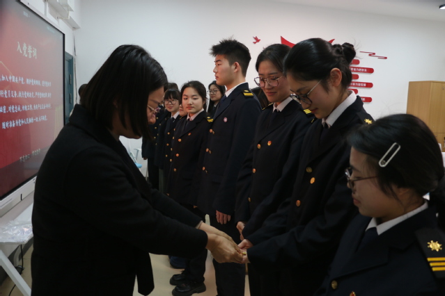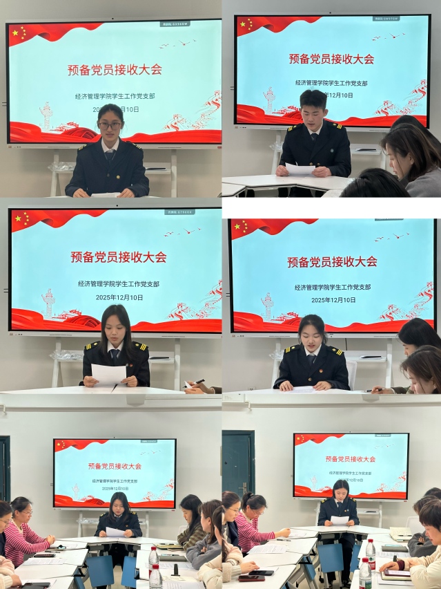 会议严格按照党支部讨论接收中共预备党员的程序进行。12位发展对象逐一宣读《入党志愿书》,汇报对党的认识、入党动机、本人履历、现实表现以及应向党组织说明的其他问题。入党介绍人分别介绍培养情况,并对其能否入党表明意见。党支部组织委员向大会报告发展对象政治审查情况。与会党员同志依次对12位同志的入党问题进行讨论、发表意见。经表决,与会正式党员一致同意接收余团等12位同志为中共预备党员。最后,经管学院党总支副书记陈佳向12位预备党员授予党徽,预备党员们面向党旗进行庄严宣誓。