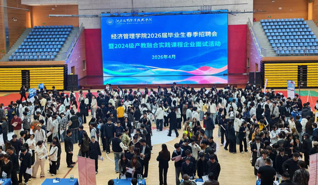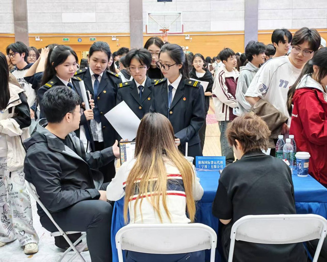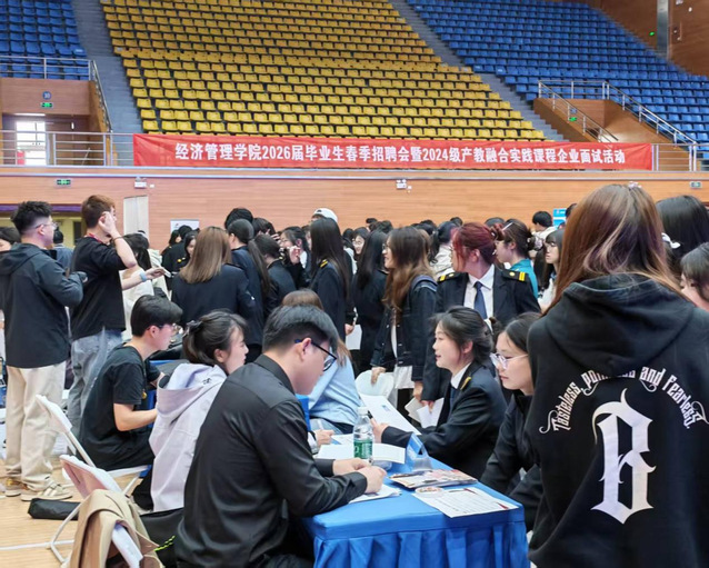 为推进毕业生高质量充分就业,深化产教融合、校企协同育人,经济管理学院于4月15日14点在学校体育馆成功举办2026届毕业生春季招聘会暨2024级产教融合实践课程企业面试活动。有中远海运空运江苏分公司、上海源闽通国际货物运输代理有限公司、深圳民生捷富凯物流有限公司等20家企业代表、2026届在校毕业生和2024级产教融合实践课程全体学生到场参加活动,现场秩序井然、气氛热烈。