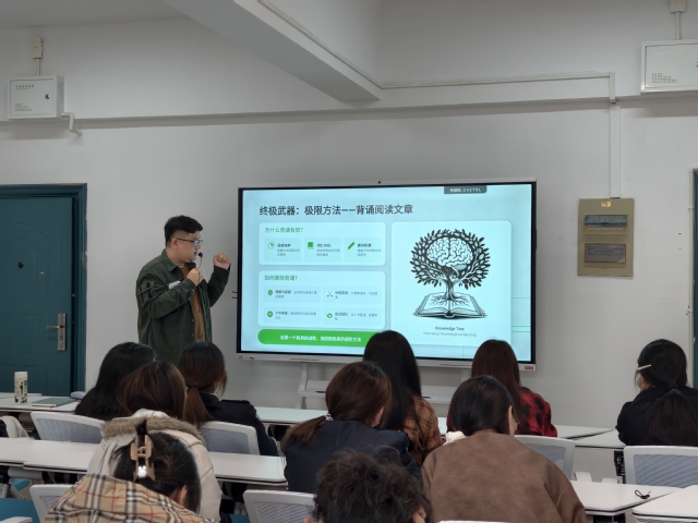 活动现场,同学们带着备考困惑认真聆听,学习氛围热烈且轻松。李睿紧扣四级考试核心考点,结合历年考情与同学们的备考痛点,拆解超全“通关秘籍”:一、讲解高频词汇高效记忆方法,帮大家快速夯实词汇基础;二、传授听力抓关键、阅读找逻辑的实用应试技巧,提升答题效率;三、指导写作思路搭建与高分句型优化,助力考场稳定发挥。